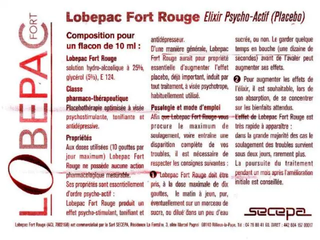 Aulas (2009) relevait qu'« Une étude a montré, par exemple, que des comprimés de lactose colorés en rose rouge entraînaient de l’énervement et de l’irritabilité alors que, colorés en bleu, ils provoquaient de la fatigue et de la somnolence chez des étudiants qui, croyant prendre des substances psychostimulantes ou sédatives, recevaient en fait du placebo. ». Ni une ni deux, le bonhomme a sorti deux produits : Le LOBEPAC Fort bleu, et le LOBEPAC Fort rouge. Sans vergogne, ces deux élixirs psycho-actifs n'ont pas honte de dévoiler leurs dessous : leur composition fait état d'éthanol à 25%, de glycérol à 5% et d'un colorant, soit rouge, soit bleu. Ils s'inscrivent tous deux dans un mouvement pharmacologique dénommé "placebothérapie" et revendiquent ne posséder aucune action pharmacologique mesurable.
