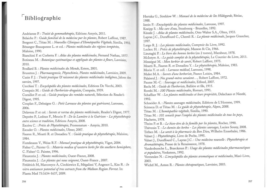 En supposant que la bibliographie de La phytothérapie. Se soigner par les plantes médicinales (Amyris, 2013) du même auteur s’applique ici (ci-dessus), seuls trois ouvrages relèvent d’une réelle caution scientifique (les traditionnels Pharmagognosie et Plantes Thérapeutiques + une étude scientifique) ; le reste s’apparente à de la vulgarisation. Or, il serait pertinent, à l’ère où la documentation scientifique récente est facilement accessible et où l’éthique professionnelle impose la citation de références actualisées, d’offrir au lecteur un accès aux sources—et notamment pour les plantes rares ou peu connues du public belge. Ce manque de transparence documentaire est d’autant plus regrettable que l’éditeur, Amyris, a déjà publié des ouvrages bibliographiés, et que l’auteur lui-même a déjà fourni des références dans d’autres livres de sa collection. Vous pouvez donc imaginer ma déception.