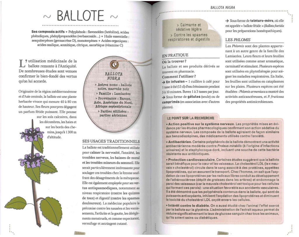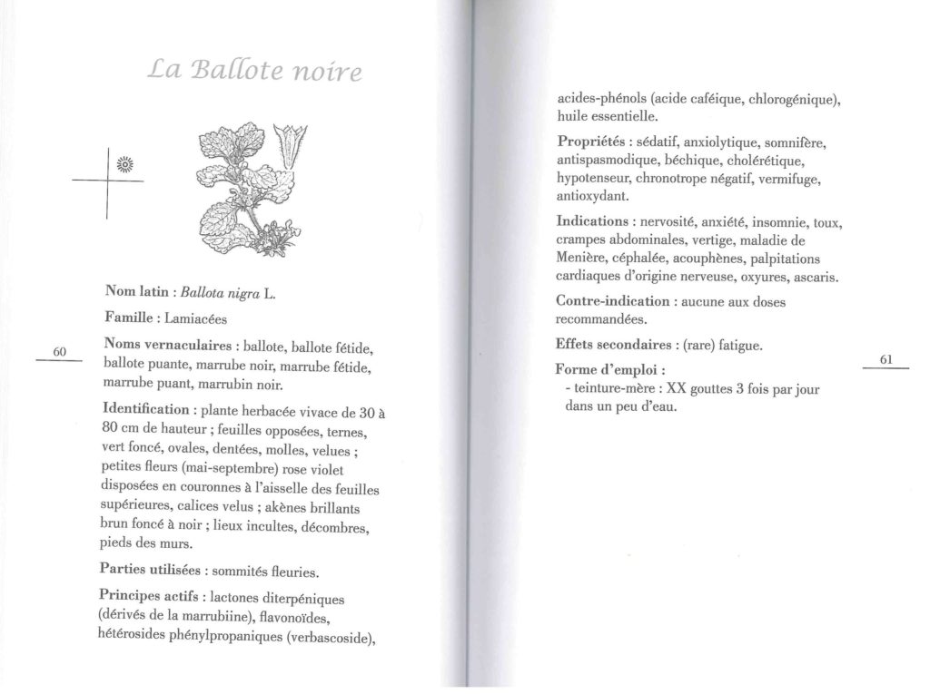 Les plantes étant au nombre de 210, vous vous doutez bien que nous n’avons pas le luxe d’analyser chacune des fiches de plantes. Nicolas et moi nous sommes rabattus sur quelques plantes, parmi elles nos fétiches car sujets de nos monographies respectives : la ballotte noire et le framboisier. Je suis d’accord avec vous c’est peu, deux plantes, pour se faire un avis sur l’entièreté du contenu, mais nous sommes limités par les moyens humains : gardez donc en tête que c’est un avis partiel.