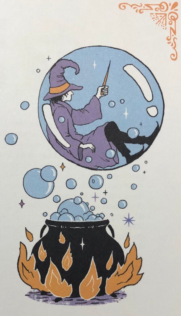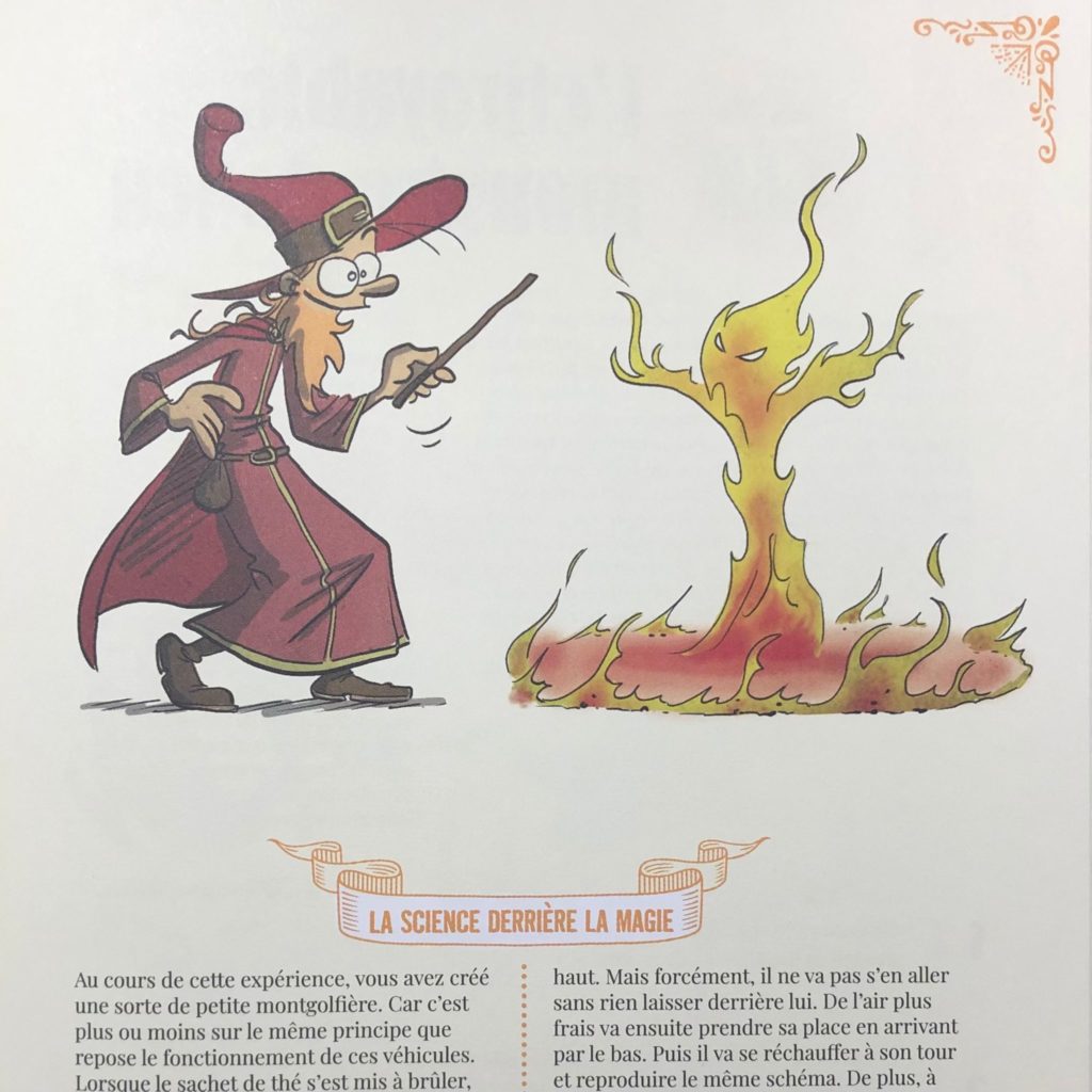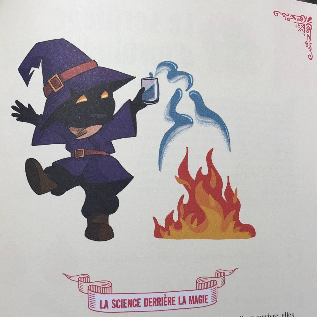 Sur une double page, la plupart du temps, chaque recette est introduite de façon amusante et dans le thème de la sorcellerie infantile. S’ensuit la procédure, et, pour finir, un paragraphe présente « La science derrière la magie ». Je regrette le mélange occasionnel des modes impératif et infinitif dans les procédures : un mode homogène était ici nécessaire.