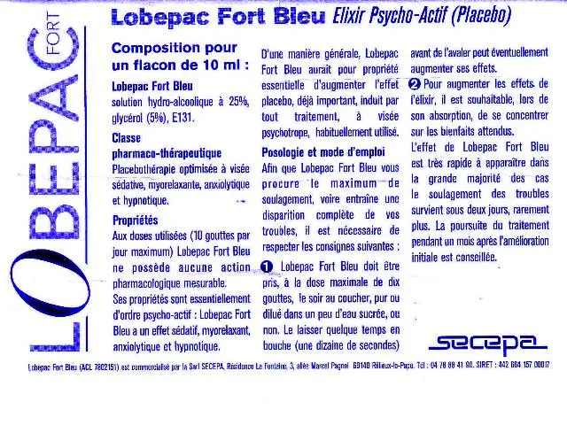 Aulas (2009) relevait qu'« Une étude a montré, par exemple, que des comprimés de lactose colorés en rose rouge entraînaient de l’énervement et de l’irritabilité alors que, colorés en bleu, ils provoquaient de la fatigue et de la somnolence chez des étudiants qui, croyant prendre des substances psychostimulantes ou sédatives, recevaient en fait du placebo. ». Ni une ni deux, le bonhomme a sorti deux produits : Le LOBEPAC Fort bleu, et le LOBEPAC Fort rouge. Sans vergogne, ces deux élixirs psycho-actifs n'ont pas honte de dévoiler leurs dessous : leur composition fait état d'éthanol à 25%, de glycérol à 5% et d'un colorant, soit rouge, soit bleu. Ils s'inscrivent tous deux dans un mouvement pharmacologique dénommé "placebothérapie" et revendiquent ne posséder aucune action pharmacologique mesurable.